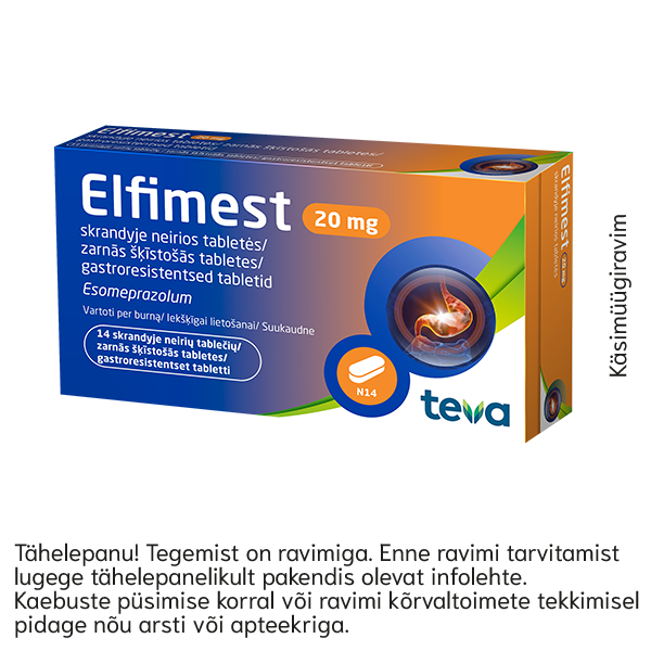 Elfimest 20 mg gastroresistentsed tabletid N14 Toimeaine:Esomeprasool. Käsimüügiravim:Elfimest (esomeprasool) tablette kasutatakse reflukshaiguse vaevuste (nt kõrvetised ja maohappe tagasivool) lühiajaliseks raviks täiskasvanutel. Ravimi infoleht Osta siit Tähelepanu! Tegemist on ravimiga. Enne