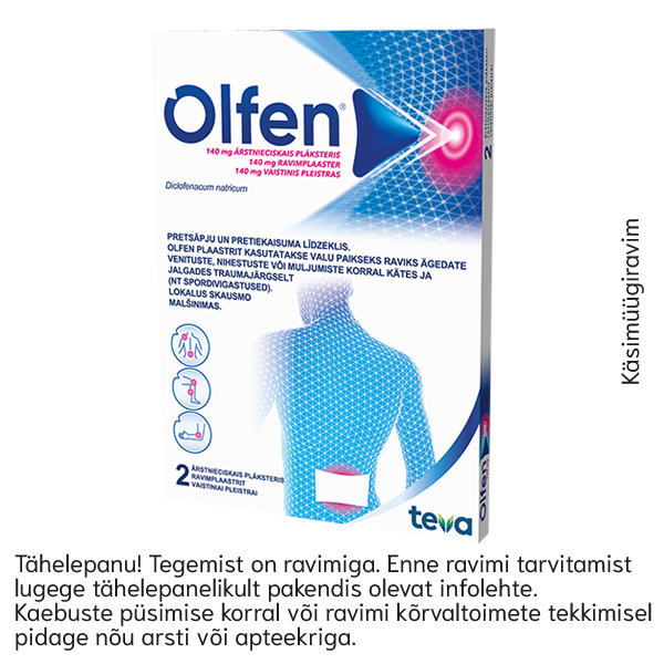 Olfen® 140 mg ravimplaaster N2 Toimeaine:Diklofenaknaatrium. Käsimüügiravim:Nõrga kuni mõõduka valu ja põletiku paikne sümptomaatiline leevendamine pärast väikeste või keskmise suurusega liigeste ja liigeste piirkonna traumat.Olfen (diklofenak) plaaster on ravim, mis