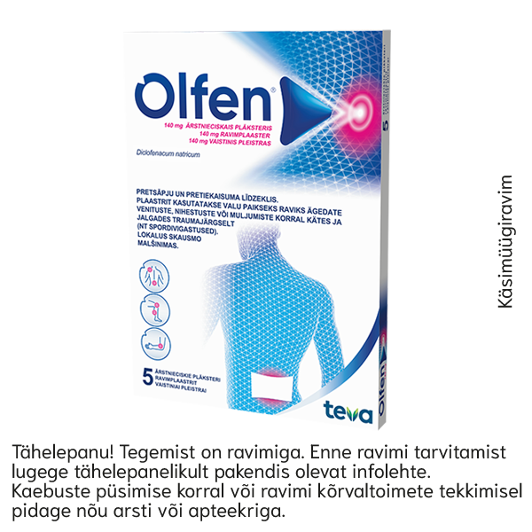 Olfen® 140 mg ravimplaaster N5 Toimeaine:Diklofenaknaatrium. Käsimüügiravim:Nõrga kuni mõõduka valu ja põletiku paikne sümptomaatiline leevendamine pärast väikeste või keskmise suurusega liigeste ja liigeste piirkonna traumat.Olfen (diklofenak) plaaster on ravim, mis