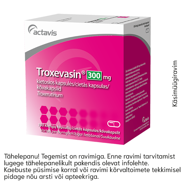 Troxevasin 300 mg kõvakapslid N100 Toimeaine:Troxerutiin. Käsimüügiravim:Täiendav ravim jalaveenide kroonilisest puudulikkusest tingitud turse korral.Troxevasin (troxerutiin) vähendab väikeste veresoonte ehk kapillaaride läbilaskvust, vältides nende endoteelirakkude basaalmembraani kahjustust mitmesuguste tegurite toimel (kapillaare